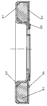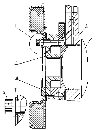 Рисунок 15. Гаситель крутильных колебаний коленчатого вала: 1 — корпус гасителя; 2 — маховик гасителя; 3 — крышка; 4 — пробка заправочного отверстия; 5 — высоковязкостная силиконовая жидкость; 6 — центровочная шайба.