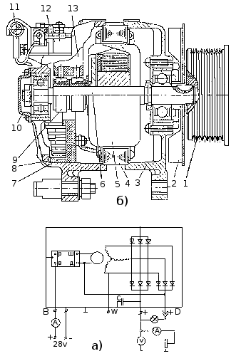 Рисунок 53-1. Генераторная установка 3122.3771: а) — электрическая схема; б) разрез; 1 — шкив; 2 — вентилятор; 3, 8 — крышки; 4 — статор; 5 — ротор; 6 — вал ротора; 7 — выпрямительный блок; 9 — контактное кольцо; 10 — крышка подшипника; 11 — подпиточный резистор; 12 — регулятор напряжения; 13 — щеткодержатель; С — конденсатор 2,2мкФ.