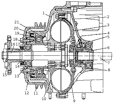 Гидромуфта привода вентилятора: 1 — передняя крышка; 2 — корпус подшипника; 3 — кожух: 4, 8, 13, 19 — шариковые подшипники; 5 — трубка корпуса подшипника; 6 — ведущий вал; 7 — вал привода гидромуфты; 9 — ведомое колесо; 10 — ведущее колесо; 11 — шкив привода генератора и жидкостного насоса; 12 — вал шкива; 14 — упорная втулка; 15 — ступица вентилятора; 16 — ведомый вал; 17, 20 — манжеты; 18 — прокладка; 21 — маслоотражатель.
