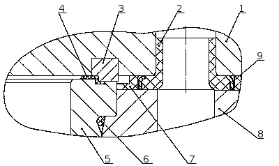 Рисунок 21. Газовый стык: 1 — головка цилиндра; 2 — кольцо уплотнигёльное перепуска охлаждающей жидкости; 3 — кольцо газового стыка; 4 — прокладка-заполнитель; 5 — гильза цилиндра; 6 — кольцо уплотнительное; 7 — прокладка уплотнительная; 8 — блок цилиндров; 9 — экран.