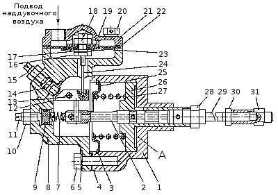 Рисунок 43. Корректор подачи топлива по давлению наддувочного воздуха: 1 — корпус корректора; 2 — золотник корректора; 3 — кольцо упорное; 4 — прокладка корпуса мембраны; 5 — шайба; 6 — болт; 7 — пружина корректора; 8 — корпус мембраны; 9 — кольцо уплотнительное; 10 — гайка; 11 — винт регулировочный; 12 — рычаг корректора; 13 — ось рычага; 14 — кольцо уплотнительное; 15 — винт регулировочный; 16 — гайка; 17 — втулка штока; 18 — гайка; 19 — шайба; 20 — болт; 21 — крышка мембраны; 22 — мембрана; 23 — тарелка; 24 — шток мембраны;23 — тарелка пружины; 26 — поршень корректора; 27 — пружина поршня; 28 — гайка; 29 — шпилька; 30 — гайка; 31 — наконечник шпильки.
