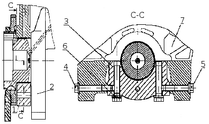 Установка крышек подшипников коленчатого вала: 1. Крышка подшипника коленчатого вала; 2. Коленчатый вал; 3. Болт крепления; 4. Болт стяжной крепления крышки подшипника левый; 5. Болт стяжной крепления крышки подшипника правый; 6. Шайба 7. Блок.