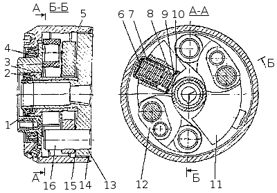 Автоматическая муфта опережения впрыскивания топлива: 1 — ведущая полумуфта; 2, 4 — манжета; 3 — втулка ведущей полумуфты; 5 — корпус; 6 — регулировочные прокладки; 7 — стакан пружины; 8 — пружина; 9, 15 — шайба; 10 — стопорное кольцо; 11 — груз с пальцем; 12 — проставка; 13 — ведомая полумуфта; 14 — уплотнительное кольцо; 16 — ось грузов.