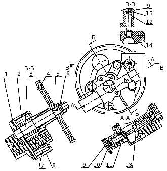 Насос масляный: 1 — крышка; 2 — корпус; 3 — шестерня ведущая; 4 — ведомое зубчатое колесо; 5 — шпонка; 6 — гайка; 7 — зубчатое колесо; 8 — ось; 9 — шплинт; 10 — пробка; 11, 12 — пружины; 13 — клапан; 14 — шарик; 15 — шайбы регулировочная.