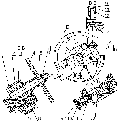 Рисунок 24. Насос масляный: 1 — крышка; 2 — корпус; 3 — шестерня ведущая; 4 — ведомое зубчатое колесо; 5 — шпонка; 6 — гайка; 7 — зубчатое колесо; 8 — ось; 9 — шплинт; 10 — пробка; 11, 12 — пружины; 13 — клапан; 14 — шарик; 15 — шайбы регулировочные.