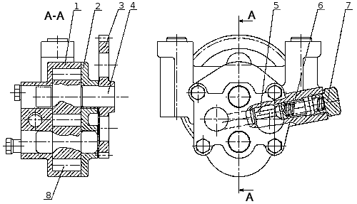 Рисунок 27. Насос масляный откачивающий: 1 — корпус; 2 — крышка; 3 — шестерня ведомая привода; 4 — вал-шестерня ведущая; 5 — клапан; 6 — пружина клапана; 7 — пробка; 8 — ведомая вал-шестерня.
