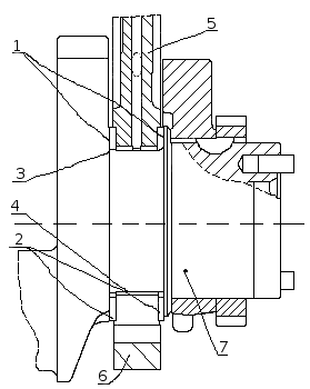 Установка упорных полуколец и вкладышей подшипников коленчатого вала: 1 — полукольцо упорного подшипника коленчатого вала верхнее; 2 — полукольцо упорного подшипника коленчатого вала нижнее; 3 — вкладыш подшипника коленчатого вала верхний; 4 — вкладыш подшипника коленчатого вала нижний; 5 — блок цилиндров; 6 — крышка подшипника коленчатого вала задняя; 7 — коленчатый вал.