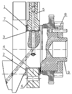 Рисунок 10. Установка упорных полуколец и вкладышей коленчатого вала: 1 — полукольцо упорного подшипника верхнее; 2 — полукольцо упорного подшипника нижнее; 3 — вкладыш подшипника коленчатого вала верхний; 4 — вкладыш подшипника коленчатого вала нижний; 5 — блок цилиндров; 6 — крышка подшипника коленчатого вала задняя; 7 — коленчатый вал; 8 — шестерня привода газораспределительного механизма; 9 — центрирующая шейка коленчатого вала.