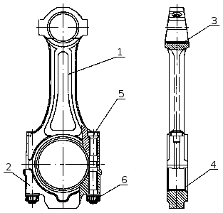 Рисунок 9. Шатун: 1 — стержень шатуна; 2 — крышка шатуна; 3 — втулка верхней головки шатуна; 4 — вкладыш нижней головки шатуна; 5 — болт крепления крышки шатуна; 6 — гайка болта крепления крышки шатуна.
