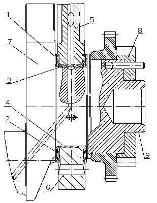 Рисунок 10. Установка упорных полуколец и вкладышей коленчатого вала: 1 — полукольцо упорного подшипника верхнее; 2 — полукольцо упорного подшипника нижнее; 3 — вкладыш подшипника коленчатого вала верхний; 4 — вкладыш подшипника коленчатого вала нижний; 5 — блок цилиндров; 6 — крышка подшипника коленчатого вала задняя; 7 — коленчатый вал; 8 — шестерня привода газораспределительного механизма; 9 — центрирующая шейка коленчатого вала.