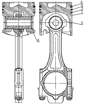 Рисунок 17. Поршень с шатуном и кольцами в сборе: 1 — поршень; 2 — маслосъемное кольцо; 3 — поршневой палец; 4, 5 — компрессионные кольца; 6 — стопорное кольцо.