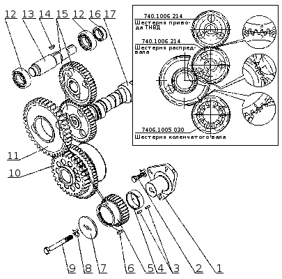 Рисунок 7. Привод агрегатов: 1 — ось ведущей шестерни привода распределительного вала; 2 — болт крепления оси; 3 — ролики 05,5x15,8 в количестве 62 шт.; 4 — втулка промежуточных роликов; 5 — шестерня ведущая; 6 — шпонка; 7 — шайба упорная; 8 — шайба замковая; 9 — болт М12х1,25х90 крепления насыпного подшипника; 10 — ведущее зубчатое колесо коленчатого вала; 11 — шестерня промежуточная; 12 — шарикоподшипники; 13 — вал колеса привода ТНВД; 14 — шпонка; 15 — шестерня привода ТНВД; 16 — втулка; 17 — распределительный вал в сборе с шестерней.