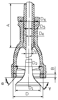 Размеры клапанов: А — длина направляющей; В — высота седла; Д — диаметр отверстия под седло; Д1 — диаметр тарелки; Д2 — диаметр седла; Д3 — диаметр стержня; Д4 — внутренний диаметр направляющей; Д5 — наружный диаметр направляющей; Д6 — диаметр отверстия под направляющую; α — угол фаски седла; γ - угол фаски клапана.