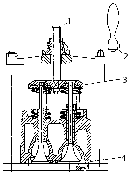 Разборка головки цилиндра в приспособлении И801.06.000: 1 — винт; 2 — вороток; 3 — тарелка; 4 — штифт.