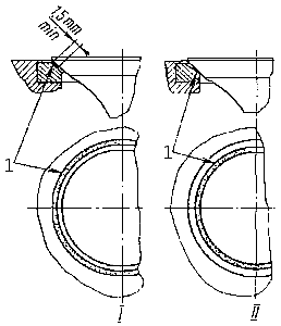 Расположение матового пояска на седле клапана: 1 — поясок притертый; I — правильное; II — неправильное.