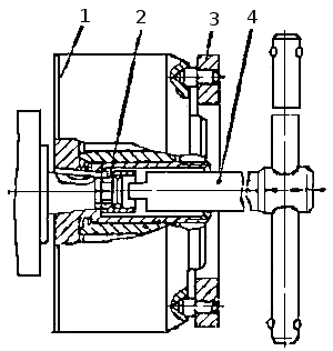 Для этого вставьте отвертку 4 в паз гайки и, удерживая муфту 1 от вращения ключом 3, отверните гайку. Затем, вворачивая в муфту съемник 2 (рис. Снятие муфты приспособлением), снимите муфту.