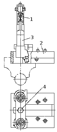 Разборка форсунки: 1 — упор; 2 — станина; 3 — форсунка; 4 — болт.