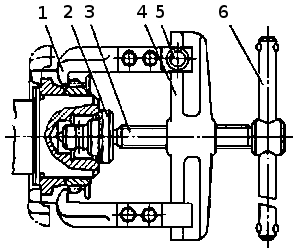 Снятие шестерни и заднего противовеса коленчатого вала съемником: 1 — захват; 2 — наконечник; 3 — винт; 4 — траверса; 5 — стопор; 6 — рукоятка.
