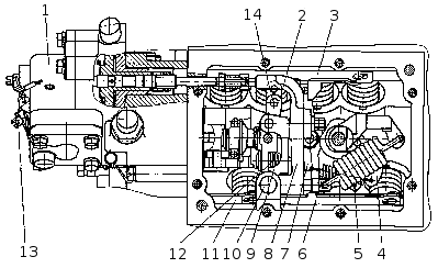 Рисунок 45. Регулятор ТНВД (вид сверху): 1 — корректор подачи топлива по давлению наддувочного воздуха; 2 — рычаг рейки; 3, 11 — рейки; 4 — рычаг стартовой пружины; 5 — главная пружина регулятора; 6 — стартовая пружина; 7 — рычаг реек; 8 — рычаг регулятора; 9 — рычаг муфты грузов; 10 — ось; 12 — обратный корректор; 13 — винт регулировки цикловой подачи топлива; 14 — штифт.
