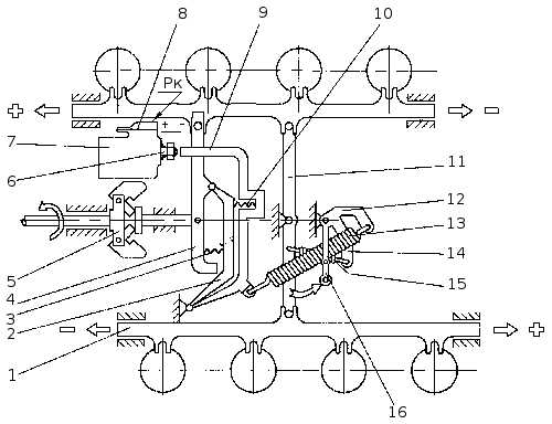 Рисунок 46. Схема работы регулятора частоты вращения: 1 — рейка ТНВД; 2 — рычаг муфты грузов; 3 — пружина обратного корректора; 4 — рычаг рейки; 5 — державка грузов; 6 — регулировочный болт подачи топлива; 7 — корректор подачи топлива по давлению наддувочного топлива; 8 — мембрана; 9 — рычаг регулятора; 10 — пружина прямого корректора; 11 — рычаг реек; 12 — рычаг пружины; 13 — пружина регулятора; 14 — рычаг стартовой пружины; 15 — стартовая пружина; 16 — рычаг управления регулятором.