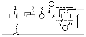 Схема проверки термореле: 1 — источник питания; 2 — реостат; 3 — амперметр; 4 — лампа контрольная; 5 — термореле; 6 — вольтметр; 7 — выключатель.