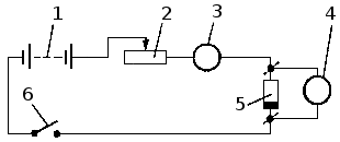 Схема проверки потребляемого свечой тока: 1 — источник питания; 2 — реостат; 3 — амперметр; 4 — вольтметр; 5 — свеча; 6 — выключатель.