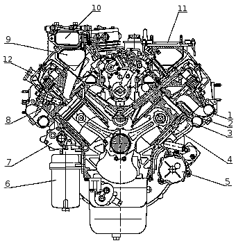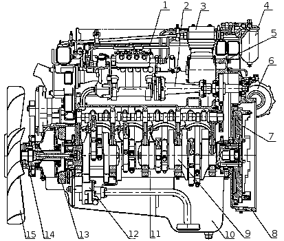 1 — топливный насос высокого давления; 2 — привод топливного насоса высокого давления; 3 — компрессор; 4 — фильтр тонкой очистки топлива; 5 — картер агретатов; 6 — турбокомпрессор; 7 — маховик; 8 — картер маховика; 9 — коленчатый вал; 10 — масляный картер; 11 — форсунка охлаждения поршня; 12 — масляный насос; 13 — гаситель крутильных колебаний; 14 — шкив привода водяного насоса и генератора; 15 — вентилятор с вязкостной муфтой.