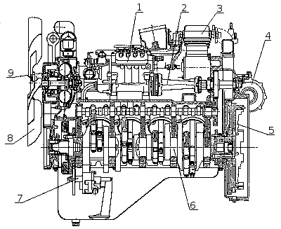 1 — топливный насос высокого давления; 2 — привод топливного насоса высокого давления; 3 — компрессор; 4 — турбокомпрессор; 5 — маховик; 6 — коленчатый вал; 7 — масляный насос; 8 — вентилятор; 9 — гидромуфта.