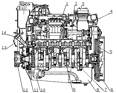 1 — топливный насос высокого давления; 2 — привод топливного насоса высокого давления; 3 — компрессор; 4 — картер агрегатов; 5 — маховик; 6 — картер маховика; 7 — коленчатый вал; 8 — масляный картер; 9 — форсунка охлаждения поршня; 10 — масляный насос; 11 — гаситель крутильных колебаний; 12 — шкив коленчатого вала; 13 — турбокомпрессор; 14 — патрубок маслоналивной.