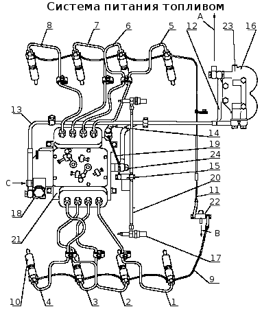 Система питания двигателя топливом: 1...8 — трубки топливные высокого давления; 9 — трубка топливная дренажная форсунок левых головок; 10 — форсунка; 11 — трубка топливная дренажная форсунок правых головок; 12 — трубка топливная отводящая ТНВД; 13 — трубка отводящая топливного насоса; 14 — трубка топливная подводящая ТНВД; 15 — клапан ЭФУ; 16 — фильтр тонкой очистки топлива; 17 — свеча факельная; 18 — топливоподкачивающий насос; 19 — трубка подвода топлива к клапану ЭФУ; 20 — трубка топливная от магнитного клапана к штифтовым свечам; 21 — ТНВД; 22 — тройник; 23 — клапан-жиклер; 24 — перепускной клапан ТНВД; А, В - слив топлива в бак; С - подвод топлива от фильтра грубой очистки топлива.