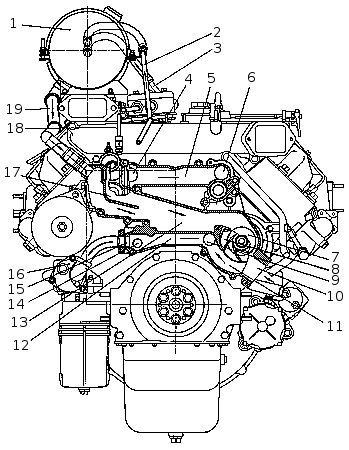 Рисунок 30. Схема системы охлаждения: 1 — расширительный бачок; 2 — пароотводящая трубка; 3 — трубка отвода жидкости из компрессора; 4 — канал выхода жидкости из правого ряда головок цилиндров; 5 — соединительный канал; 6 — канал выхода жидкости из левого ряда головок цилиндров; 7 — входная полость водяного насоса; 8 — водяной насос; 9 — канал входа жидкости в левый ряд гильз цилиндров; 10 — канал подвода жидкости в водяной насос из радиатора; 11 — выходная полость водяного насоса; 12 — соединительный канал; 13 — перепускной канал из водяной коробки на вход водяного насоса; 14 — канал входа жидкости в правый ряд гильз цилиндров; 15 — канал отвода жидкости в теплообменник масляный; 16 — теплообменник масляный; 17 — водяная коробка; 18 — трубка подвода жидкости в компрессор; 19 — перепускная труба.
