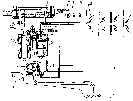 Схема смазочной системы двигателя: 1 — насос масляный; 2 — клапан; 3 — фильтр; 4 — перепускной клапан; 5 — частично-поточный фильтроэлемент; 6 — водомасляный теплообменник; 7, 8 и 9 — приборы контроля; 10 — форсунки охлаждения поршней; 11 — термоклапан; 12 — полнопоточный фильтроэлемент; 13 — картер масляный; 14 — клапан предохранительный.