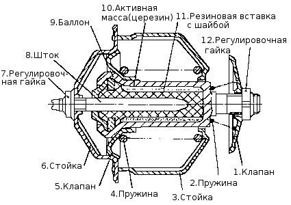 При достижении температуры охлаждающей жидкости 80°С активная масса 10, заключенная в баллоне 9, плавится, увеличиваясь в объеме, и выдавливает шток 8. При этом баллон 9 перемещается вправо, открывая клапан 5, а клапан 1 закрывает вход жидкости в перепускную трубу к водяному насосу. Охлаждающая жидкость начинает циркулировать через радиатор. В диапазоне температур 80-93°С клапаны 1 и 5 открыты частично, охлаждающая жидкость проходит через радиатор и перепускную трубу на вход к насосу. При температуре 93°С клапан 5 открывается полностью, а клапан 1 закрывается, при этом вся жидкость циркулирует только через радиатор.