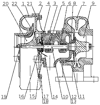 Рисунок 29. Турбокомпрессор ТКР 7С-6: 1 — корпус компрессора; 2 — крышка; 3 — корпус подшипников; 4 — подшипник упорный; 5 — подшипник; 6 — кольцо стопорное; 7 — корпус турбины; 8 — кольцо уплотнительное; 9 — колесо турбины; 10 — вал ротора; 11 — экран турбины; 12 — планка; 13 — болт; 14 — маслоотбрасывающий экран; 15 — втулка; 16 — маслоотражатель; 17 — планка; 18 — болт; 19 — гайка; 20 — колесо компрессора; 21 — кольцо уплотнительное; 22 — диффузор.