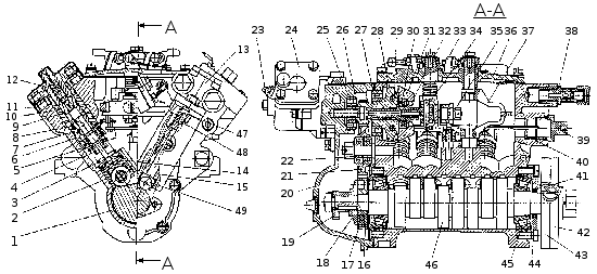 Рисунок 44. Топливный насос высокого давления (ТНВД 337-20) с топливоподкачивающим насосом: 1 — корпус ТНВД; 2 — толкатель; 3 — пружина толкателя; 4 — поворотная втулка; 5 — рейка; 6 — корпус секции ТНВД; 7 — плунжер; 8 — втулка плунжера; 9 — кольцо уплотнительное; 10 — седло нагнетательного клапана; 11 — клапан нагнетательный; 12 — штуцер; 13 — насос топливоподкачивающий; 14 — сухарь; 15 — толкатель; 16 — шестерня регулятора ведущая; 17 — сухарь ведущей шестерни; 18 — фланец ведущей шестерни; 19 — эксцентрик топливоподкачивающего насоса; 20 — крышка регулятора задняя; 21 — крышка регулятора промежуточная; 22 — подшипник шестерни регулятора промежуточный; 23 — винт регулировки цикловой подачи топлива; 24 — корректор подачи топлива по давлению наддувочного воздуха; 25 — подшипник крышки регулятора; 26, 44 — регулировочные прокладки; 27 — подшипник державки грузов; 28 — державка грузов; 29 — ось грузов; 30 — упорный подшипник муфты регулятора; 31 — груз; 32 — муфта регулятора; 33 — возвратная пружина рычага останова; 34 — палец; 35 — прямой корректор; 36 — верхняя крышка регулятора; 37 — рычаг пружины регулятора; 38 — перепускной клапан; 39 — пробка рейки; 40 — втулка рейки; 41 — манжета; 42 — фланец ведомой полумуфты; 43 — полумуфта ведомая; 45 — подшипник кулачкового вала; 46 — кулачковый вал; 47 — втулка штока; 48 — шток толкателя; 49 — ролик.