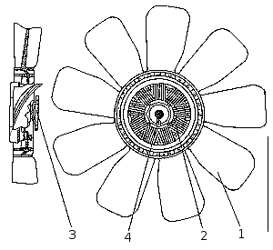 Рисунок 33. Вентилятор с муфтой привода: 1 — вентилятор; 2 — муфта; 3 - ступица; 4 — термобиметаллическая спираль.