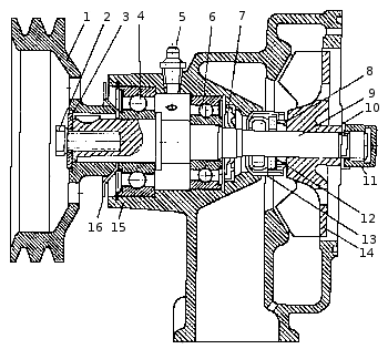Насос водяной: 1 — шкив; 2 — болт; 3, 10 — шайбы; 4, 6 — подшипники; 5 — пресс-масленка; 7 — манжета; 8 — уплотнительное кольцо с обоймой; 9 — вал; 11 — колпачковая гайка; 12 — упорное кольцо; 13 — уплотнение (сальник); 14 — крыльчатка; 15 — корпус; 16 — пылеотражатель.