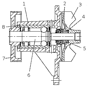 Рисунок 31. Насос водяной: 1 — корпус; 2 — сальник; 3 — крыльчатка; манжета уплотнительная; 5 — кольцо скольжения; 6 — подшипник радиальный шарико-роликовый с валиком; 7 — шкив; 8 — кольцо упорное.